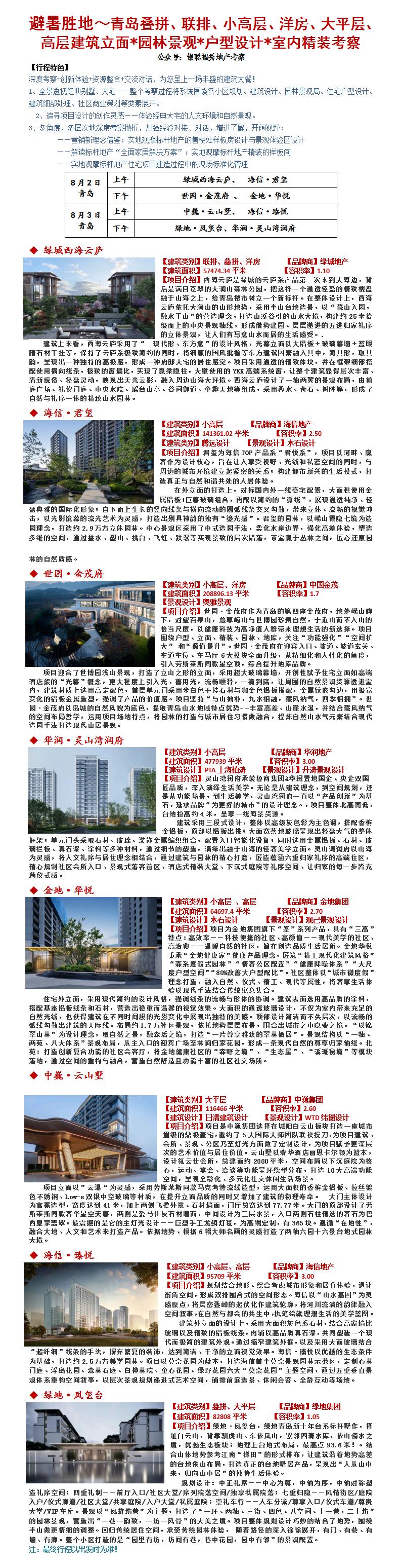 25年8月2-3日青岛叠拼、联排、小高层、洋房、大平层、高层建筑立面*园林景观*户型设计*室内精装考察