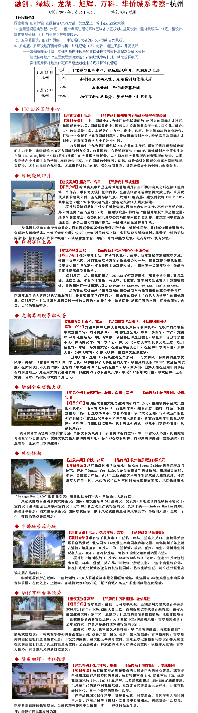 2019年7月25-26日杭州融创、绿城、龙湖、旭辉、万科、华侨城系考察