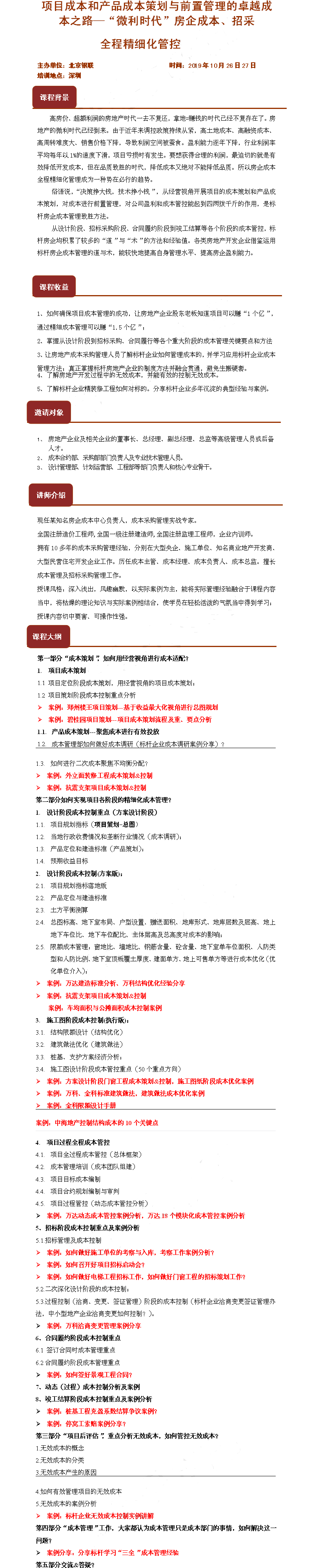 2019年10月26日27日深圳项目成本和产品成本策划与前置管理的卓越成本之路—“微利时代”房企成本、招采 全程精细化管控