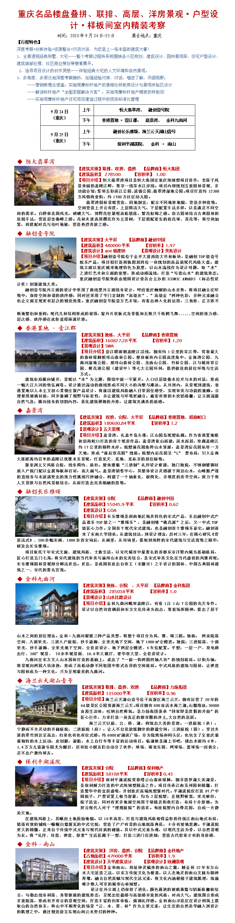 20年9月24-25重庆名品楼盘叠拼、联排、高层、洋房景观·户型设计·样板间室内精装考察