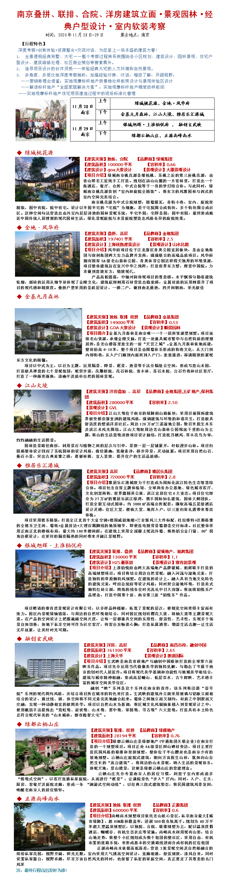 20年11月28-29日南京绿城·金基·融创叠拼、联排、合院、洋房建筑立面·景观园林·经典户型设计·室内软装考察