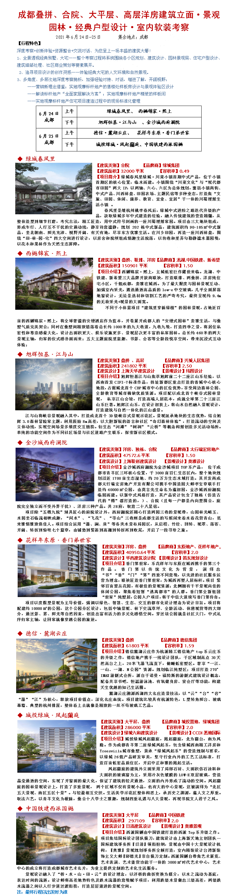 21年6月24-25日成都叠拼、合院、大平层、高层洋房建筑立面·景观园林·经典户型设计·室内软装考察
