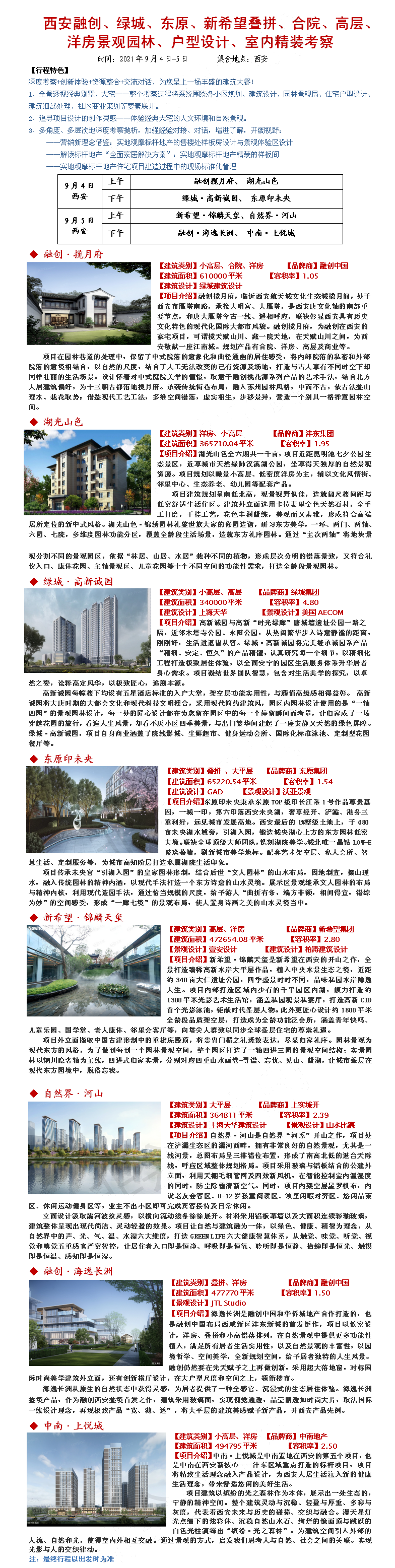 21年9月4-5日西安融创、绿城、东原、新希望叠拼、合院、高层、洋房景观园林、户型设计、室内精装考察