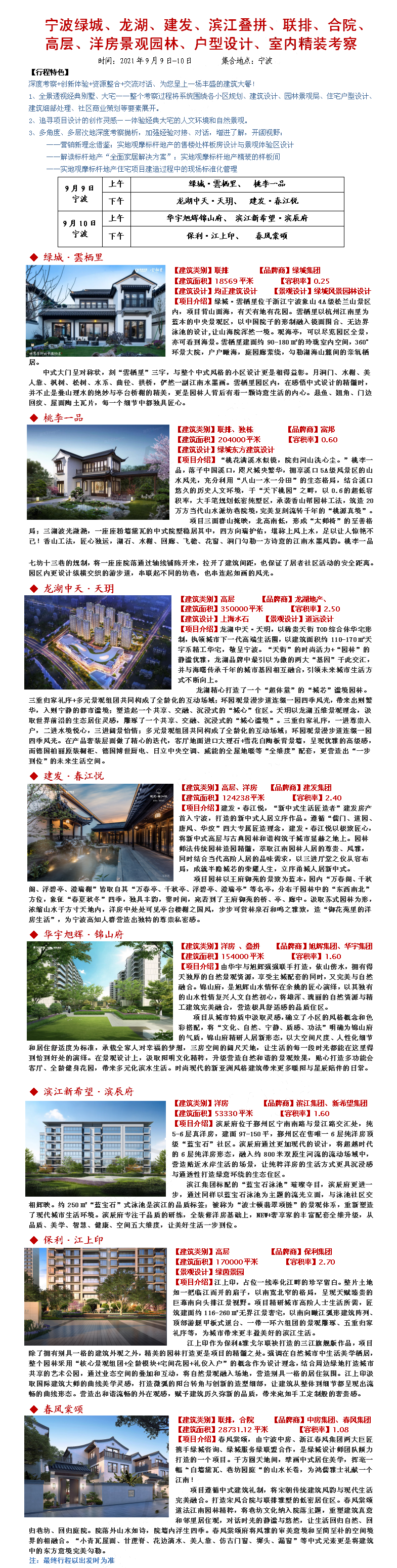 21年9月9-10日宁波绿城、龙湖、建发、滨江叠拼、联排、合院、高层、洋房景观园林、户型设计、室内精装考察