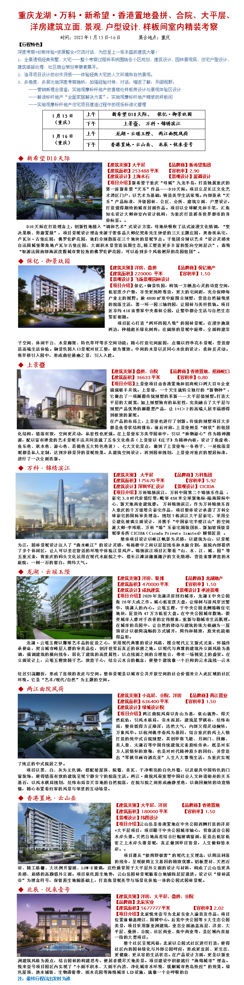 22年1月15-16重庆龙湖·万科·新希望·香港置地项目建筑立面.景观.户型设计.室内精装考察