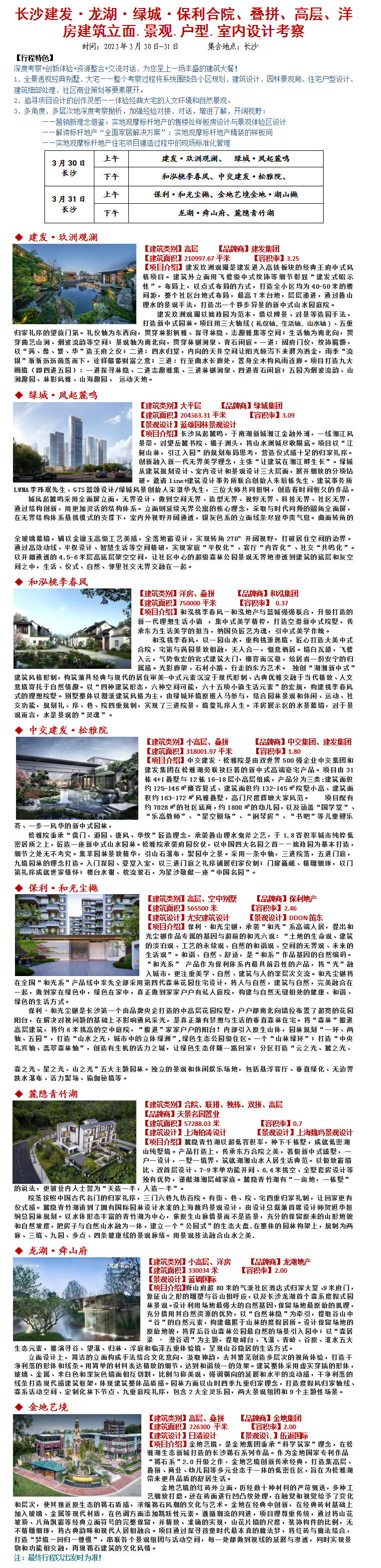23年3月30-31日长沙建发·龙湖·绿城·保利合院、叠拼、高层、洋房建筑立面.景观.户型.室内设计考察
