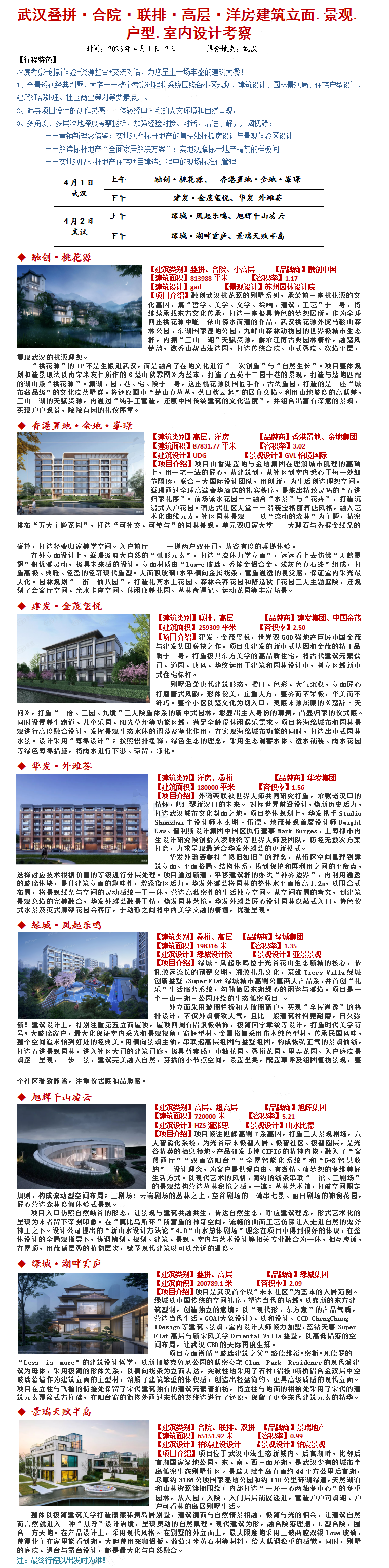 23年4月1-2日武汉叠拼·合院·联排·高层·洋房建筑立面.景观.户型.室内设计考察