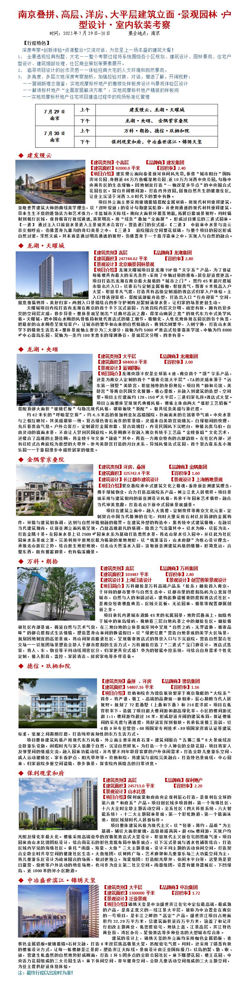 23年7月29-30日南京叠拼、高层、洋房、大平层建筑立面·景观园林·户型设计·室内软装考察