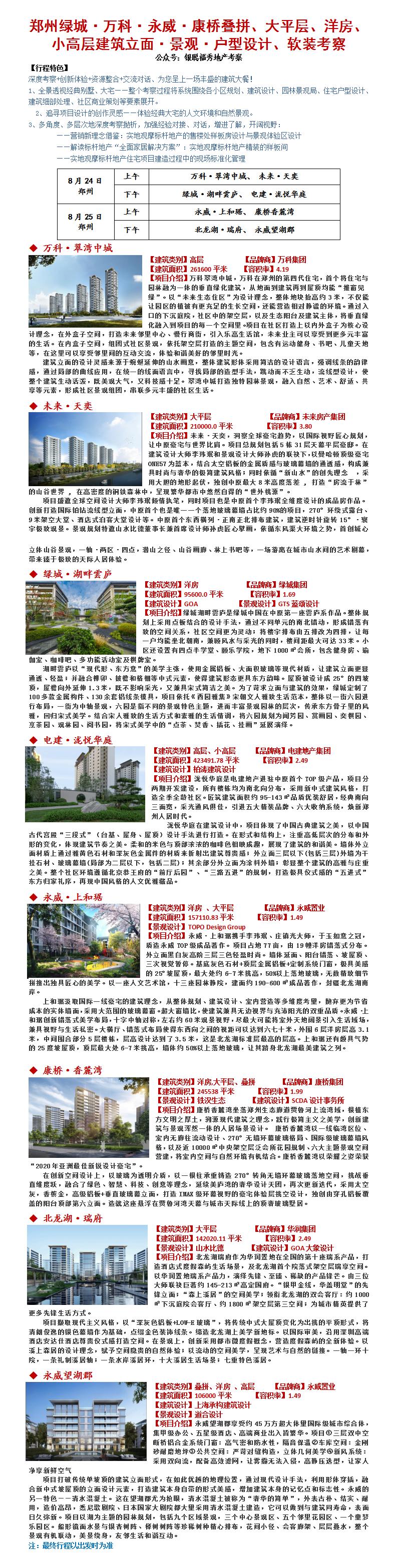 23年8月24-25日郑州绿城·万科·永威·康桥叠拼、大平层、洋房、小高层建筑立面·景观·户型设计、软装考察