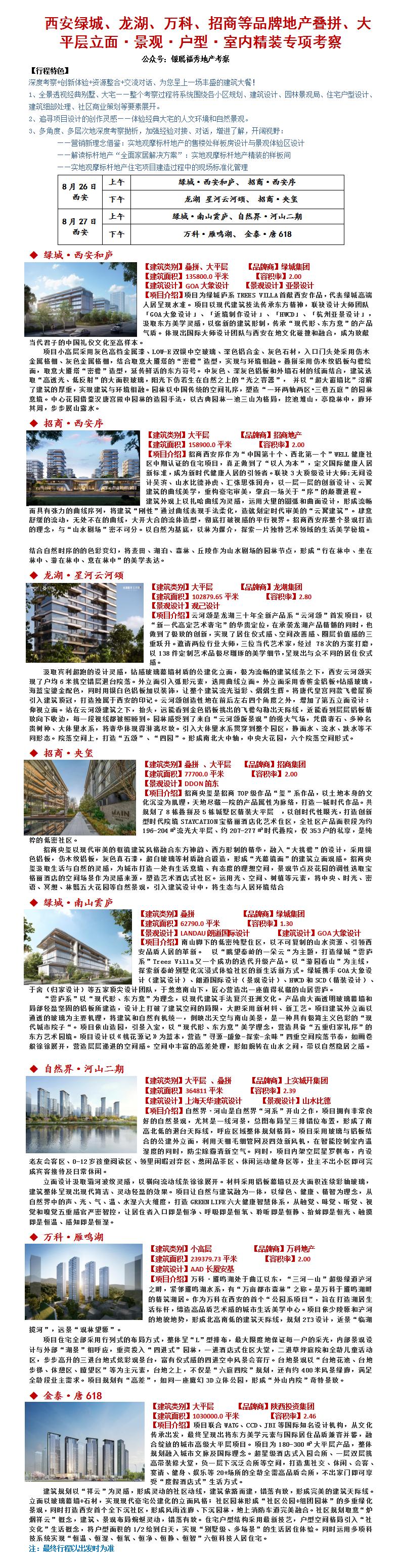 23年8月26-27日西安绿城、龙湖、万科、招商等品牌地产叠拼、大平层立面·景观·户型·室内精装专项考察